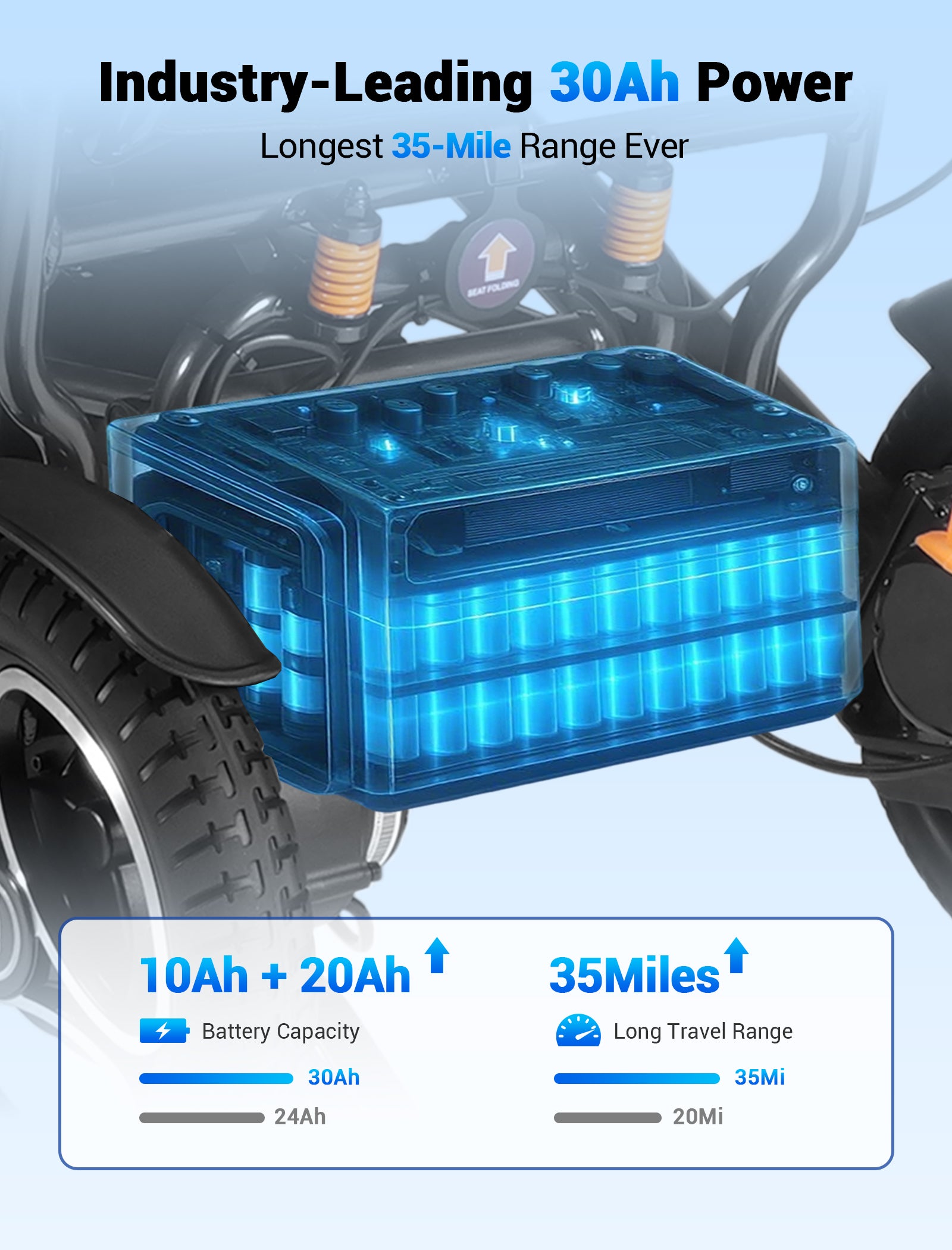 - 【DUAL BATTERY SYSTEM FOR VERSATILITY】 Equipped with two lithium batteries: a 24V/20AH battery for extended daily use (up to 35 miles per charge) and a separate 24V/10AH battery (under 300WH) that is airline-compliant for safe and convenient travel. Perfect for long outings and air travel.