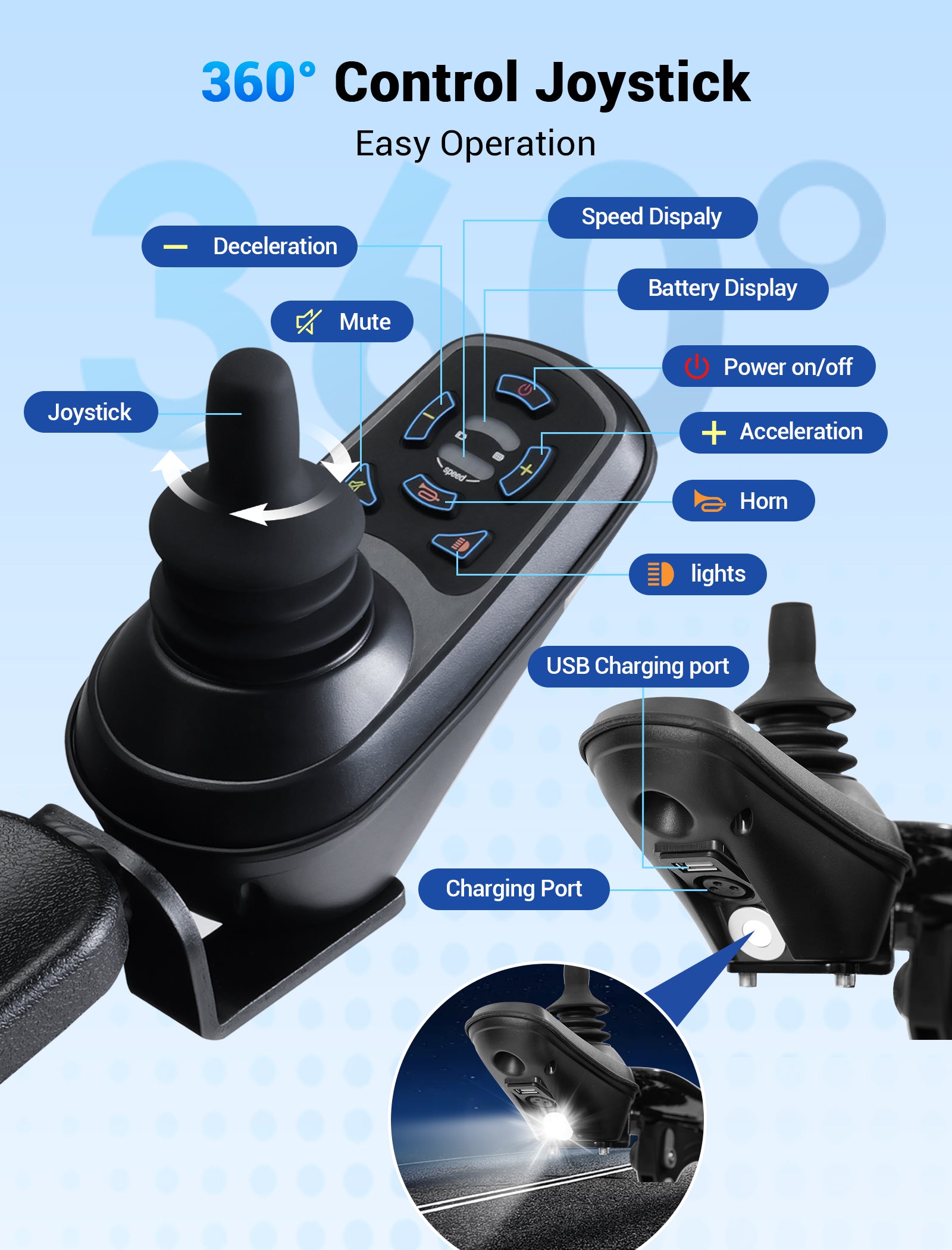 - 【SUPERIOR COMFORT & ADJUSTABILITY】 Designed for all-day comfort with a padded seat cushion, adjustable height armrests, and a supportive backrest. The ergonomic joystick controller is easily positioned on either the left or right side for personalized operation.