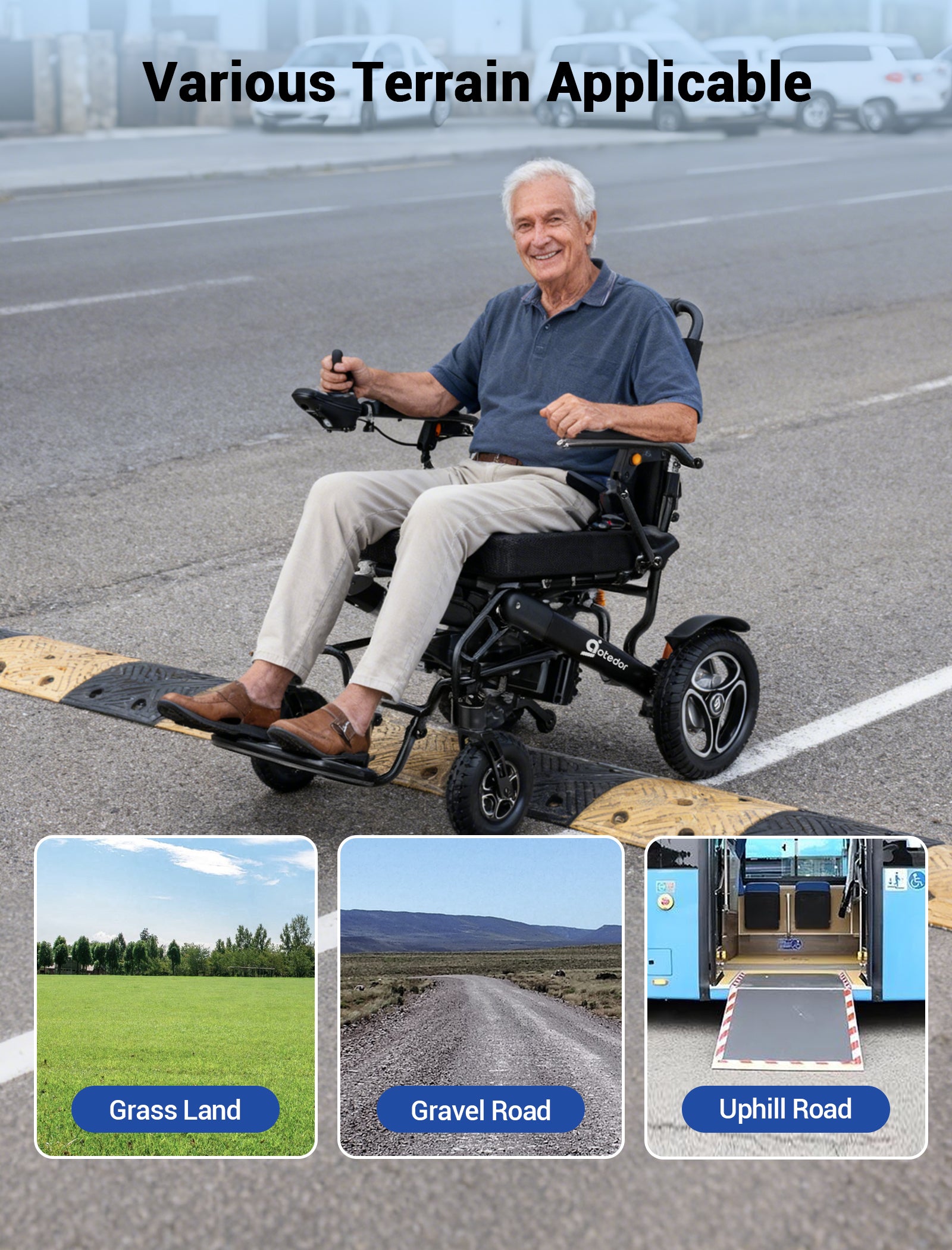 - 【EASY TO USE & FOLDABLE】 Effortlessly fold and unfold the wheelchair for compact storage and transport. Simple controls include an intuitive joystick for direction and speed, an ON/OFF button, speed settings (S1-S5), LED light, and horn. Ideal for seniors and individuals with mobility challenges.
